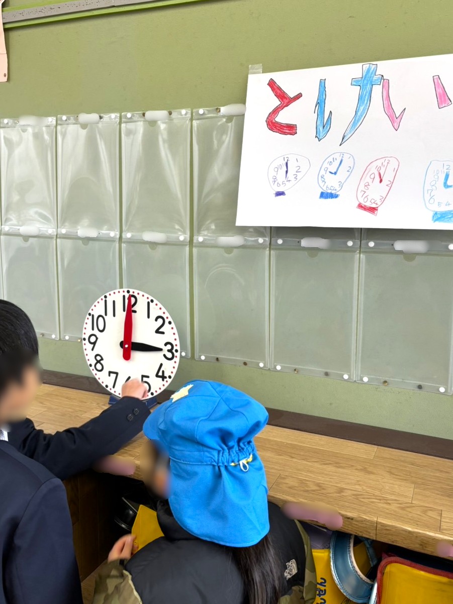 教室では『こくご』『さんすう』『とけい』『せいかつ』などに分かれて学校でやっている授業の一部を体験させてもらいました。