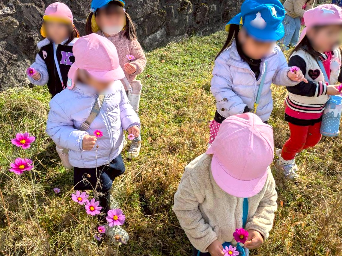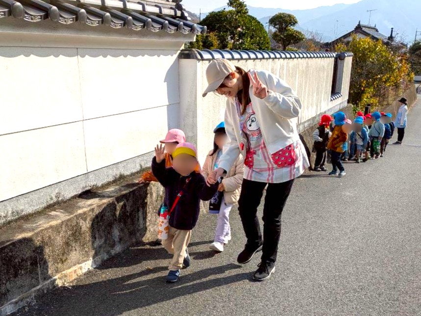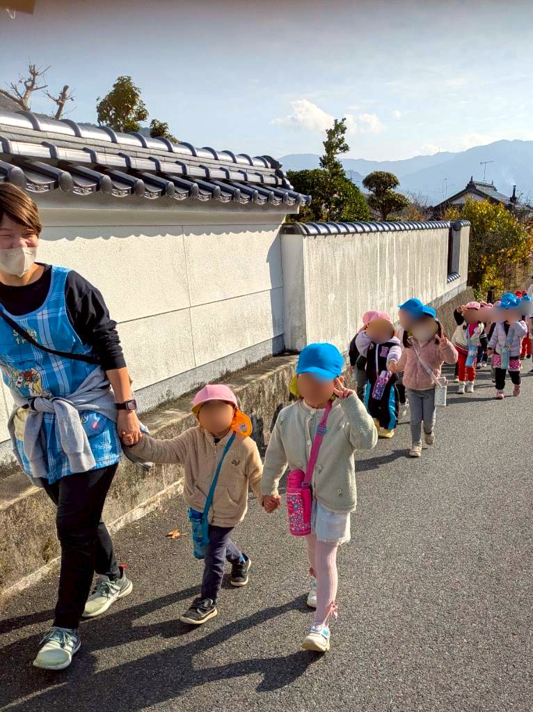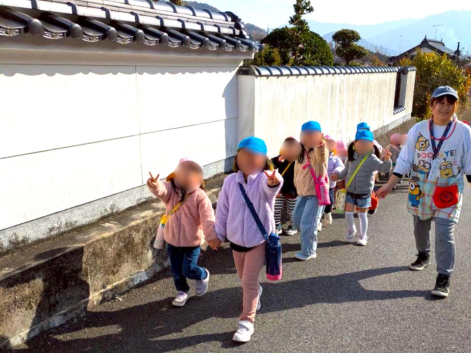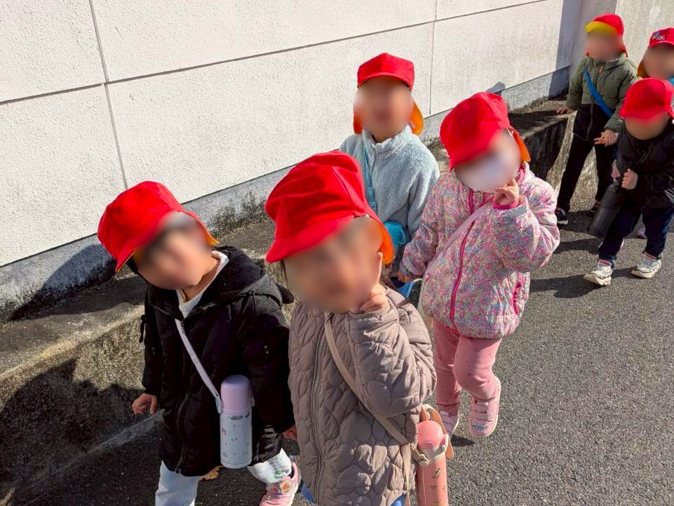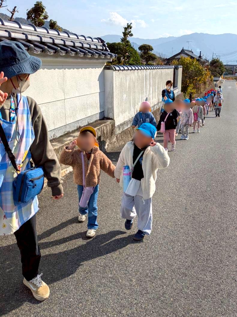 先日、とっても天気のよい日に年長、年中、年少クラスで幼稚園の近くをぐるっとお散歩に出かけました。