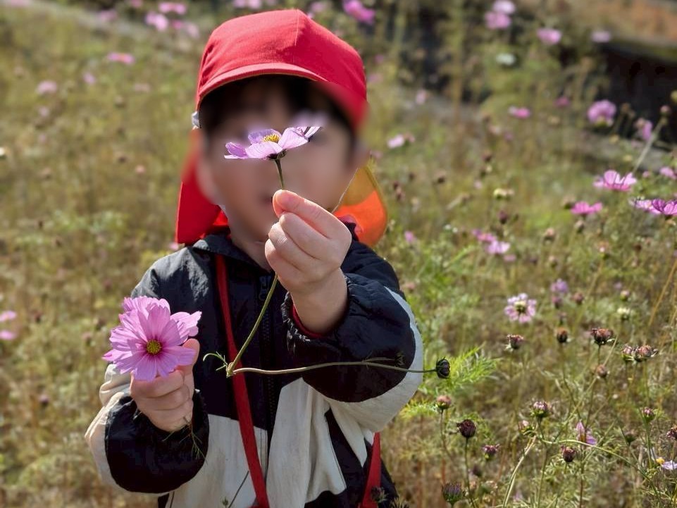 途中、コスモス畑にてお花を見ていたら、摘んでもいいよと言っていただけたのでみんなでコスモスをたくさん集めました